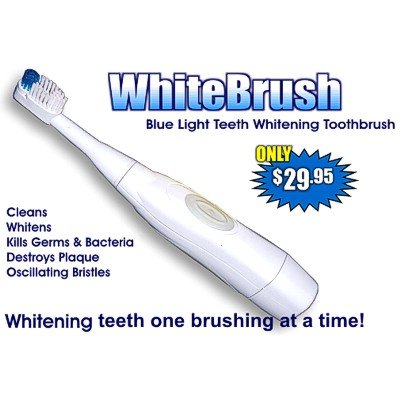 Our revolutionary WhiteBrush teeth whitening product combines the cleaning power of an oscillating head with light, the same light used by professionals to whiten and brighten your teeth! Not only will it whiten when used with any Peroxide toothpaste, our blue spectrum light also kills germs and bacteria making your mouth cleaner, fresher and whiter than ever before! Try that with an ordinary toothbrush! Never before has maintaining that great smile been so easy and cost effective! The WhiteBrush toothbrush combines 5 great features in one affordable product that simply does it all! The WhiteBrush toothbrush is the only whitening toothbrush with oscillating bristles combined with blue light technology that's easy to use, cost saving and convenient!